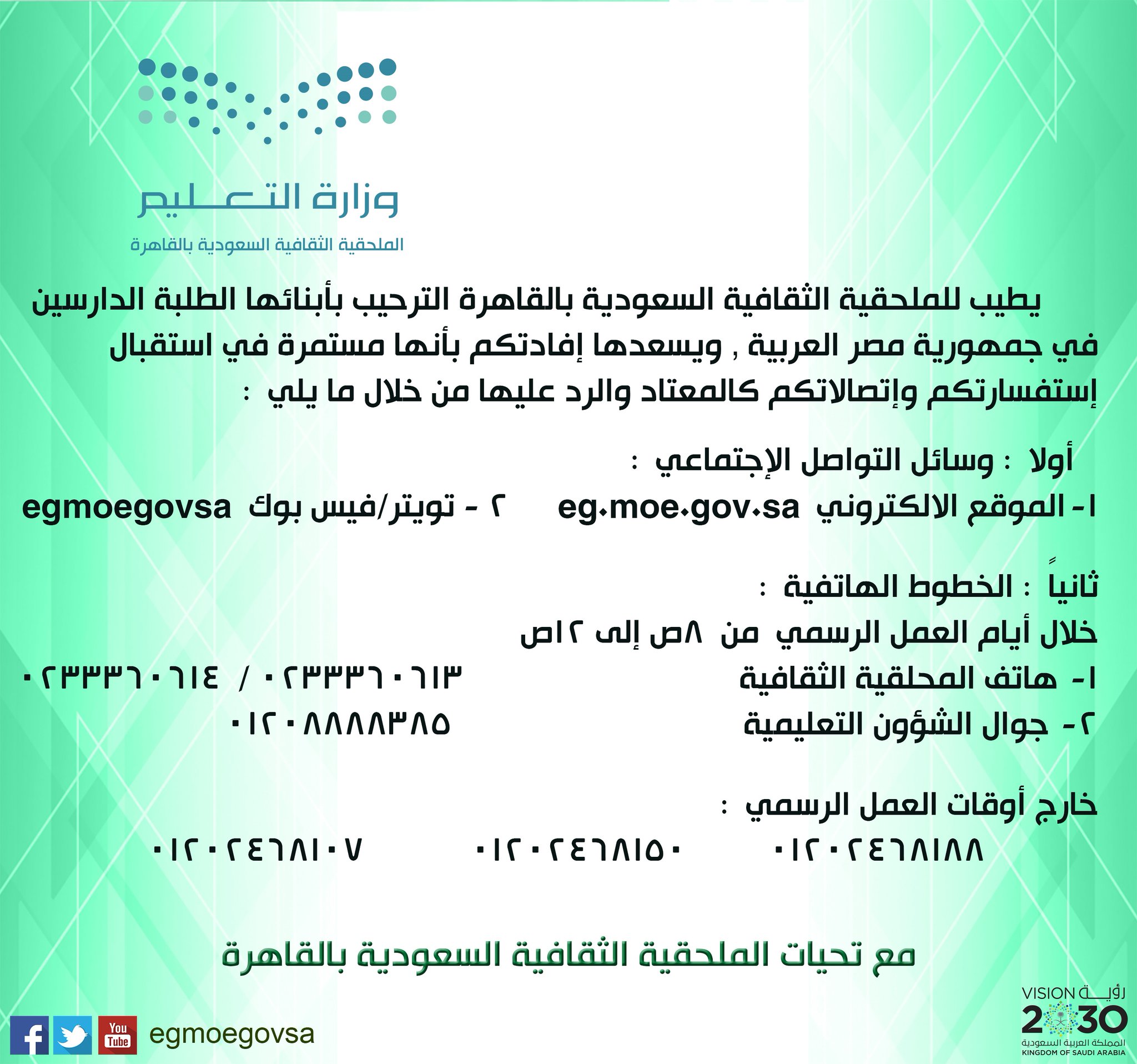 الملحقية الثقافية السعودية بمصر On Twitter يطيب للملحقية الثقافية السعودية بالقاهرة الترحيب بأبنائها الطلبة الدارسين في جمهورية مصر العربية ويسعدها إفادتكم بأنها مستمرة في استقبال إستفسارتكم وإتصالاتكم الملحقية الثقافية السعودية بالقاهرة Https