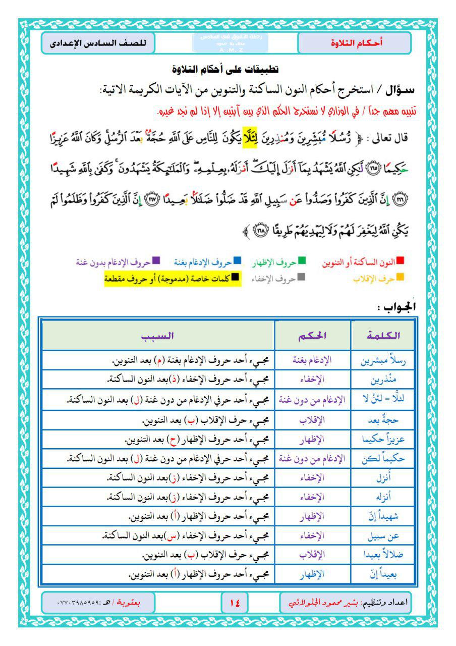 ورقة عمل عن احكام النون الساكنة والتنوين فى التربية الدينية الاسلامية للصف السادس الابتدائي نبراس الامارات